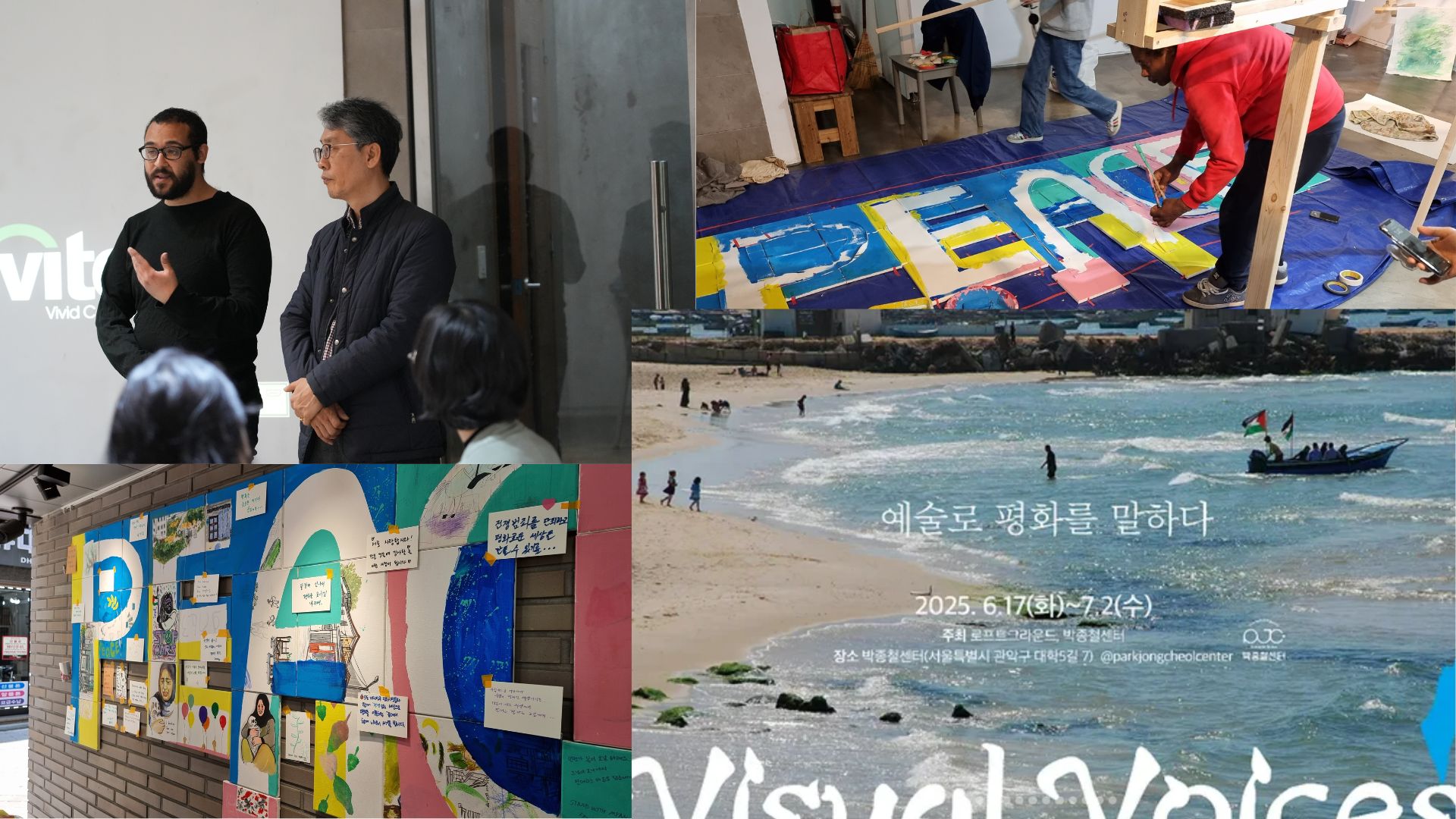 <Visual Voices>는 2024년에 팔레스타인과 연대하는 목소리를 내기 위하여 처음 시작되었습니다. 올해는 혐오와 분열 속에서 세계 곳곳의 문제들에 관한 다양한 목소리를 예술을 통해 ‘평화’로 말하며 확장하고, 또 연결해가고 있습니다. 전시에 연대한 한옥커즈 멤버들(살레, 정아, 유리, 매튜, 베레켓 등)의 활동도 만나시고, ‘박종철센터’에서 진행중인 상설 전시와 기획 전시도 보고 오세요!