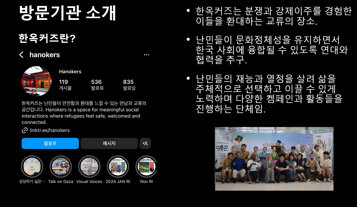 "활동가 분들과의 인터뷰를 통해 난민이 단지 도움이 필요한 존재가 아니라, 한국 사회의 일원으로살아가기 위해 노력하는 분들이라는 것을 알게 되었습니다."
